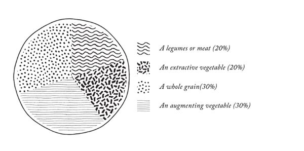 A complete, balanced meal contains four components that come together in the 60:40 proportion of augmenting and extractive foods. Here are the four components and how much of the plate they should take up.